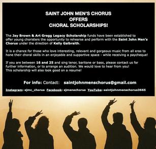 The Jay Brown- Arthur Gregg Legacy Scholarship Fund was established in 2023 by the Saint John Men's Chorus. The goal is to attract new talents to the group and give those aspiring singers the opportunity to test and hone their musical skills and provide them with a solid base to help launch them into the realm of choral singing.