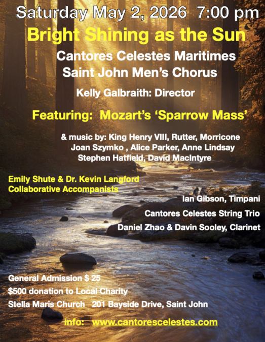 On Saturday May 2, at 7 pm, a stunning program of gorgeous Choral Music will be performed by Cantores Celestes Maritimes and Saint John Men's Chorus under the direction of Artistic Director, Kelly Galbraith. These highly trained choristers will sing music from all eras that will delight and inspire. They will be joined by the Cantores Celestes String Trio, Ian Gibson -timpani; Daniel Zhao & David Sooley, clarinets and fabulous collaborative accompanists Emily Shute and Dr. Kevin Langford.