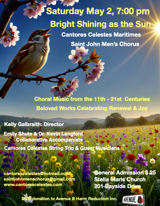 You won't want to miss our spring concert 'Bright Shining as the Sun' on Saturday May 2, 7 pm at Stella Maris Church in Saint John. This stunning program of gorgeous choral music will be performed by the combined 53-voices of the Saint John Men's Chorus and the auditioned women's choir Cantores Celestes Maritimes, both led by Artistic Director, Kelly Galbraith. These highly trained choristers will sing music from all eras that will captivate and inspire. They will be joined by the Cantores Celestes String Trio, timpanist Ian Gibson, clarinetists David Dow & David Sooley, and our fabulous collaborative accompanists, Emily Shute and Dr. Kevin Langford.
