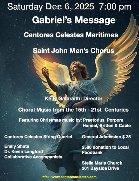 On Saturday Dec 6, at 7 pm, a stunning program of Christmas Choral Music will be performed by Cantores Celestes Maritimes and Saint John Men's Chorus under the direction of Artistic Director, Kelly Galbraith. These highly trained choristers will sing music from all eras that will delight and inspire. They will be joined by the Cantores Celestes String Quartet, and fabulous collaborative accompanists Emily Shute and Dr. Kevin Langford.